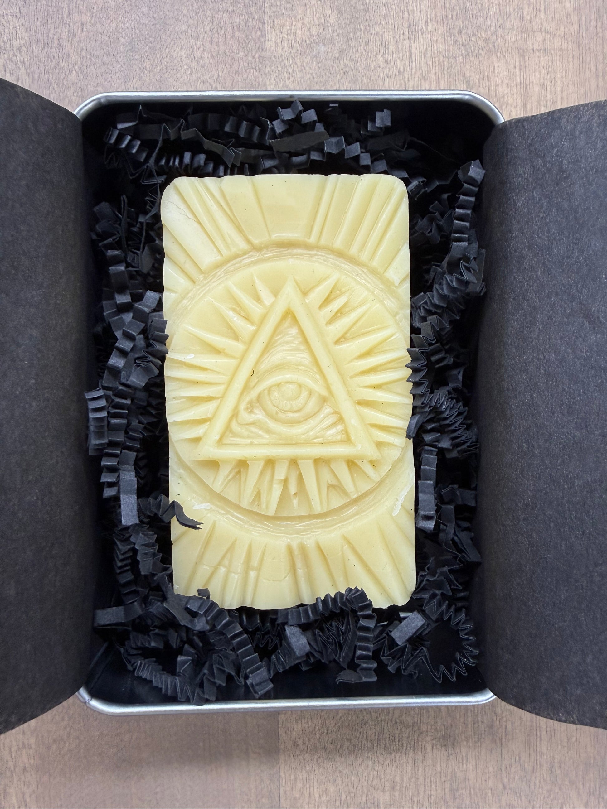 Candles come packaged in a 5" x 3.5" tin box that can also be used as a tray to burn the candle on.