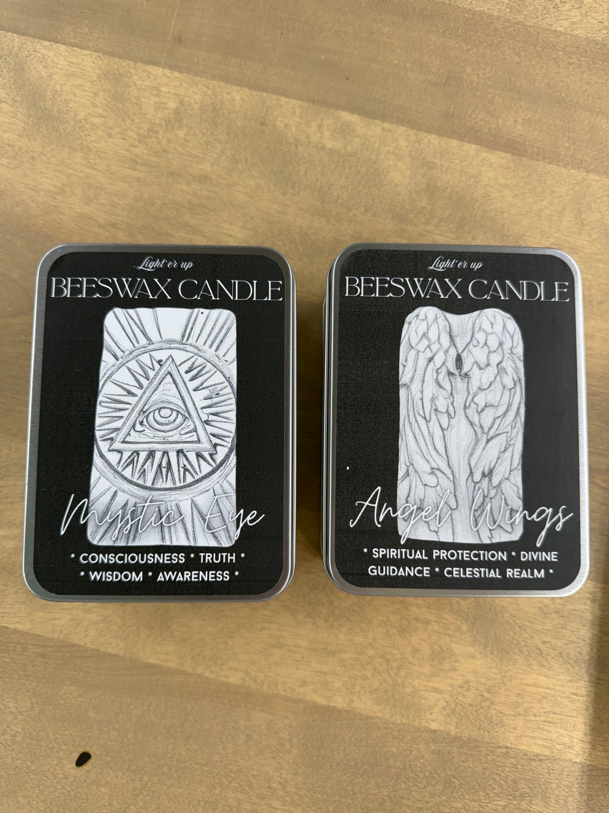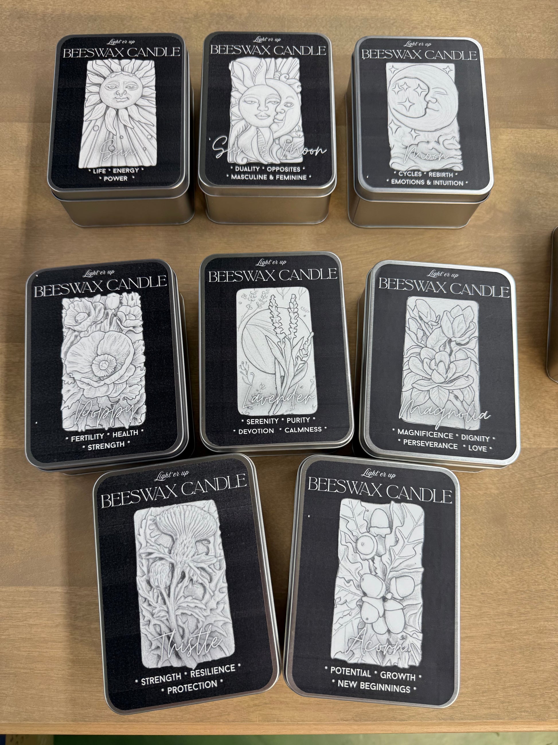 Hand poured decorative beeswax candles featuring a range of beautiful images.